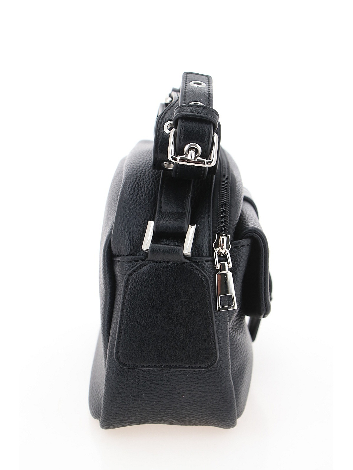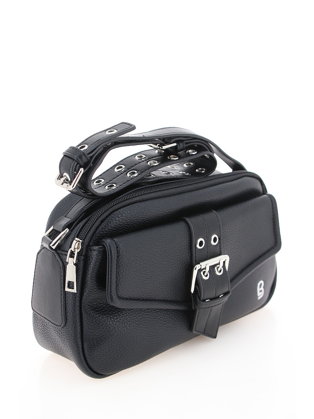 Компактная женская сумка BADEN черного цвета — стильный и практичный аксессуар для повседневного гардероба. Модель из мягкой искусственной кожи с зернистой фактурой имеет прямоугольную слегка скругленную форму. Лицевая сторона украшена накладным карманом с клапаном и декоративным ремешком с массивной металлической пряжкой и люверсами. В нижнем углу расположен лаконичный логотип бренда «B». Широкий плечевой ремень декорирован металлическими люверсами по всей длине. Основное отделение закрывается на молнию. Фурнитура серебристого цвета эффектно контрастирует с черной кожей. Эта сумка станет стильным дополнением ваших прогулок и повседневных образов. оптом в Хабаровске