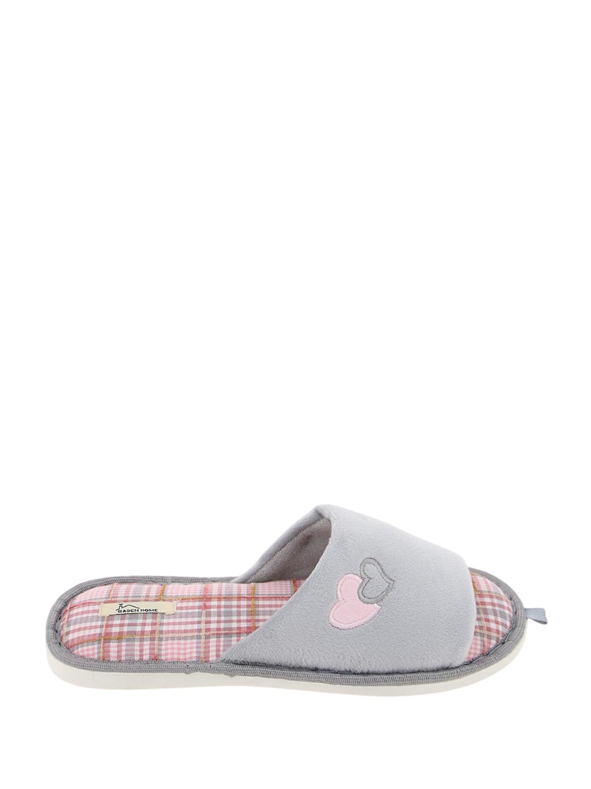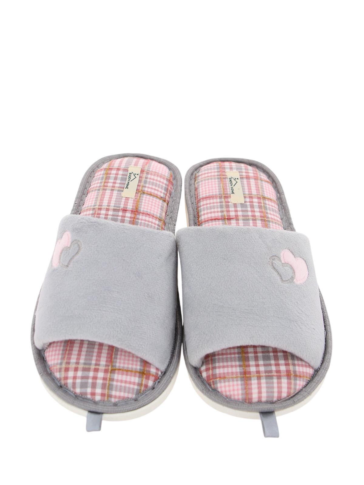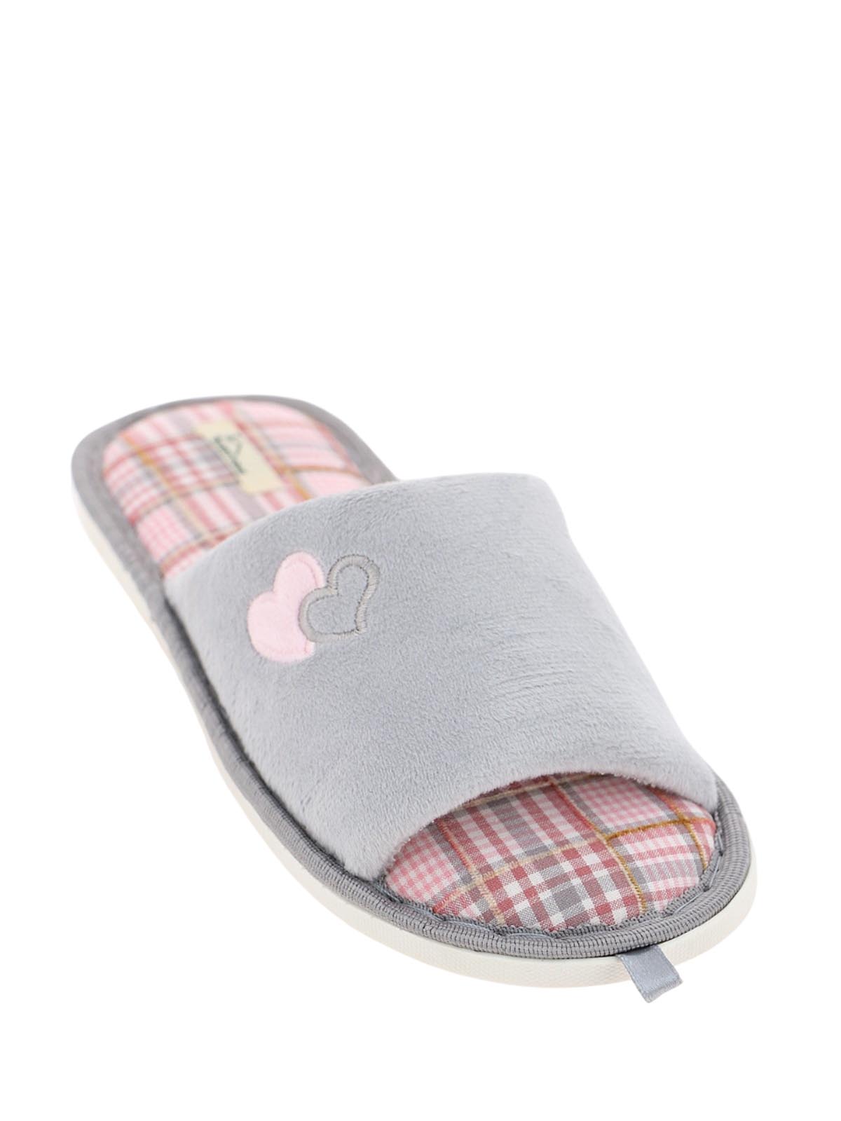 Женские светло-серые домашние тапочки с открытым носом и пяткой, украшенные вышитым сердечком. Модель на плоской подошве ориентирована на уют и легкость для отдыха дома.