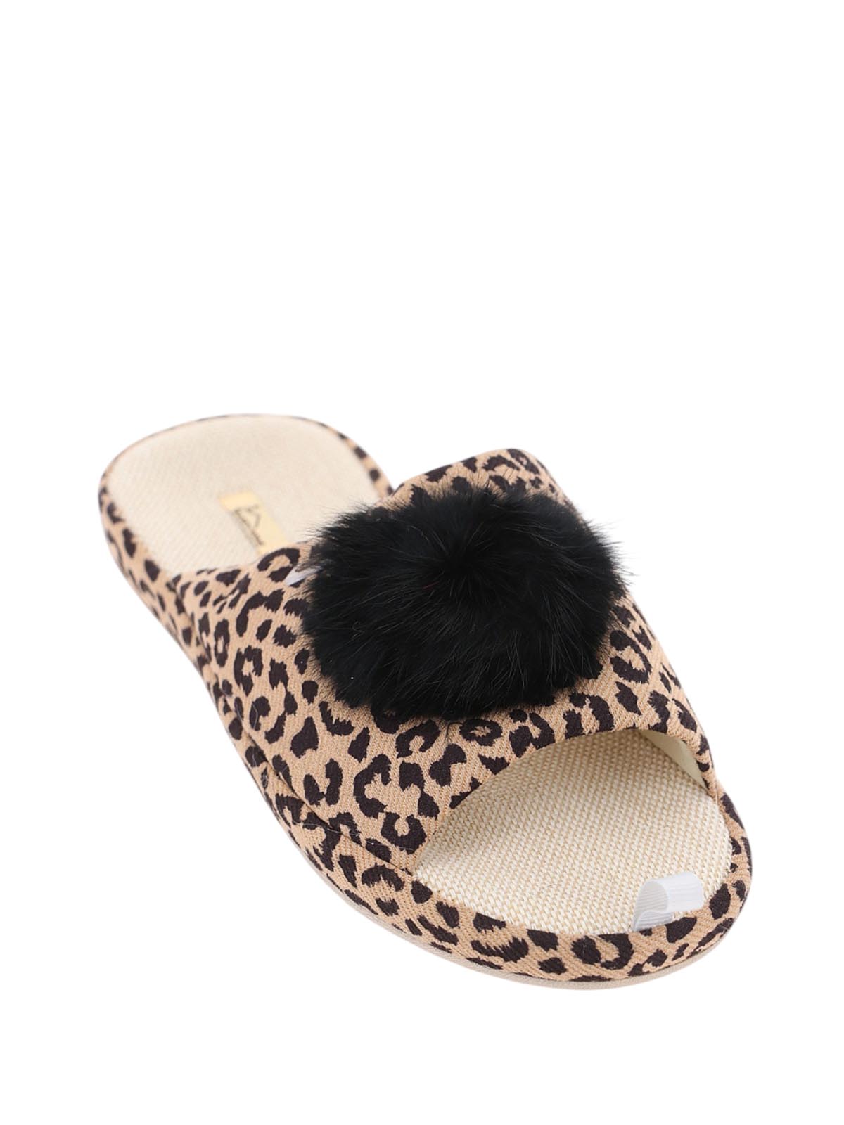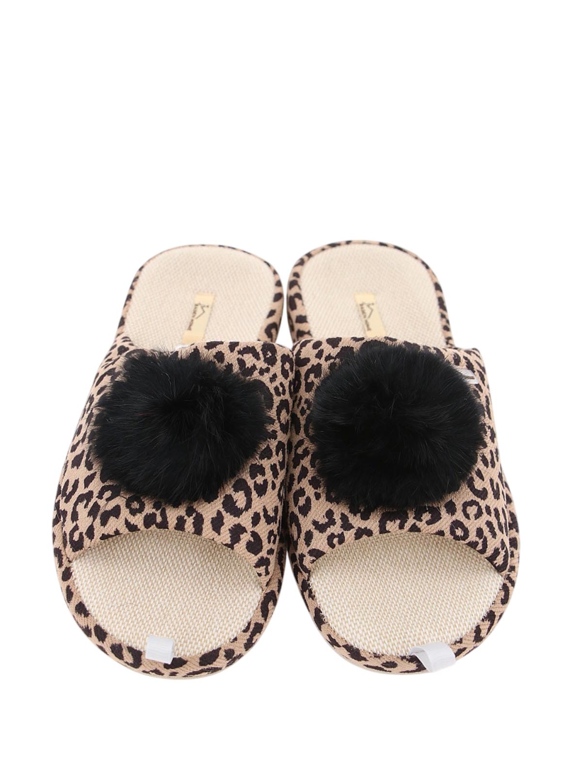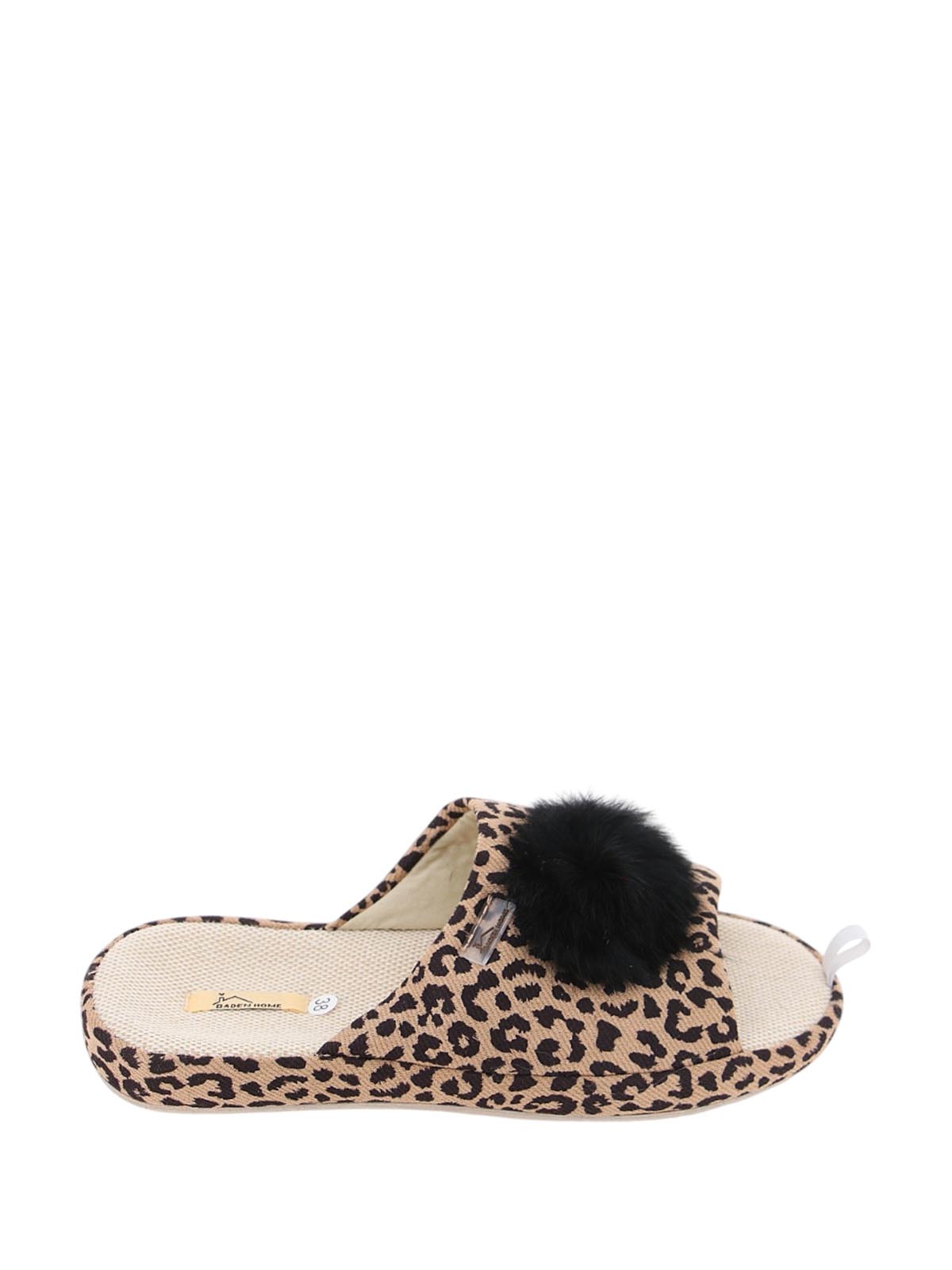 Женские леопардовые домашние тапочки BADEN с открытым носом и пяткой, толстой подошвой и черным меховым помпоном. Модель сочетает яркий дизайн и комфорт для уютного отдыха.